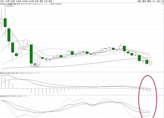 月K線圖的MACD指標則在0軸線之下,KDJ指標三值已經(jīng)進入超賣區(qū)域。