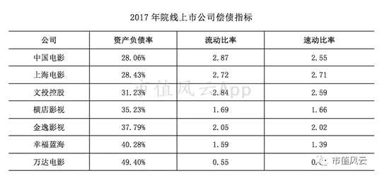 在7家院線上市公司中,2017年萬(wàn)達(dá)電影的資產(chǎn)負(fù)債率為49.40%,流動(dòng)比率為0.55,速動(dòng)比率為0.54次,償債能力表現(xiàn)最差。這7家同行上市公司中,無(wú)論是短期長(zhǎng)期能力指標(biāo)還是長(zhǎng)期償債能力指標(biāo),萬(wàn)達(dá)電影都排在了最后,償債能力堪憂。