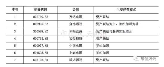 目前A股共計(jì)有7家電影院線上市公司,分別是萬(wàn)達(dá)電影(002739.SZ)、金逸影視(002905.SZ)、幸福藍(lán)海(300528.SZ)、【文投控股(600715)、股吧】(600715.SH)、中國(guó)電影(600977.SH)、上海電影(601595.SH)、橫店影視(603103.SH)。