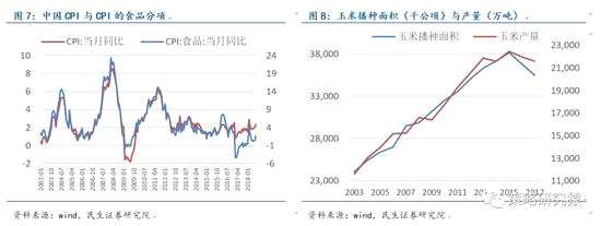 我國(guó)食品價(jià)格存在上漲壓力,將對(duì)CPI產(chǎn)生較大影響。糧食價(jià)格面臨上漲壓力。2003年以來,我國(guó)的CPI同比漲幅與CPI中的食品分項(xiàng)高度相關(guān),表明從權(quán)重上看,食品對(duì)CPI影響很大。2016與2017年我國(guó)玉米的播種面積和產(chǎn)量均出現(xiàn)下降,為玉米價(jià)格提供支持。國(guó)際油價(jià)上漲背景下,以糧食為原料的生物燃料需求提升,給糧食帶來漲價(jià)壓力。同時(shí),油價(jià)上漲將提高農(nóng)藥、化肥的生產(chǎn)成本,提高農(nóng)業(yè)機(jī)械的燃料成本,從成本側(cè)帶來糧食價(jià)格上漲壓力。貿(mào)易摩擦導(dǎo)致中國(guó)提高從美國(guó)進(jìn)口的大豆、玉米等農(nóng)作物的關(guān)稅25%,低價(jià)進(jìn)口農(nóng)產(chǎn)品對(duì)我國(guó)農(nóng)產(chǎn)品價(jià)格的壓制作用將明顯緩解。