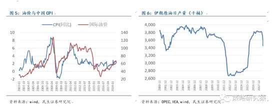供給風(fēng)險(xiǎn)下,油價(jià)仍有上漲壓力,并將對(duì)我國(guó)CPI構(gòu)成上行壓力。2003年以來,我國(guó)CPI的波動(dòng)趨勢(shì)與國(guó)際原油價(jià)格的走勢(shì)關(guān)聯(lián)性較強(qiáng),在2003年-2004年、2007年-2008年,2009年-2011年國(guó)際油價(jià)快速上漲的階段,我國(guó)的CPI漲幅均出現(xiàn)明顯上升。受美國(guó)制裁影響,大多數(shù)伊朗原油的進(jìn)口國(guó)停止或?qū)⑼V箯囊晾蔬M(jìn)口原油,2018年8月-9月伊朗原油產(chǎn)量大幅減少。9月伊朗原油產(chǎn)量減少至345萬桶/日,銷量?jī)H為163萬桶/日,較第二季度的高峰減少80萬桶/日。隨著11月4日美國(guó)對(duì)伊朗原油出口制裁生效,伊朗的原油供給仍有下行風(fēng)險(xiǎn)。伊朗威脅封鎖霍爾木茲海峽,中東地區(qū)政局仍不穩(wěn)定,原油供給面臨較大不確定性。原油供給因素在過去5輪油價(jià)上漲周期中發(fā)揮了重要作用。未來原油供給的風(fēng)險(xiǎn)可能導(dǎo)致油價(jià)繼續(xù)上行,從而給中國(guó)帶來通貨膨脹壓力。