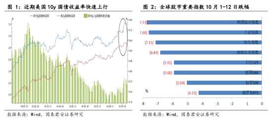 近期美國10Y國債快速上行,全球權(quán)益市場承壓。自2018年10月4日美10y國債收益率升破3.2%,8月24日為2.8%,10月1日之后加速尤為明顯,已創(chuàng)2011年中以來新高,10月12日略微下降至3.16%。從10y-2y利差來看,本次國債利率的上行更多體現(xiàn)了對于經(jīng)濟(jì)預(yù)期變化方面的變化,而流動性趨于緊張因素影響相對要弱一些。美國債利率的上行直接引致了權(quán)益市場的調(diào)整,10月1日-12日美國標(biāo)普500下跌5.04%,納斯達(dá)克指數(shù)下跌6.83%,MSCI發(fā)達(dá)市場下跌5.52%,MSCI新興市場下跌6.47%,從行業(yè)表現(xiàn)來看,新興市場信息科技類表現(xiàn)最弱。綜合來看,美10y國債的快速上行,直接引致了全球權(quán)益市場的調(diào)整,相對來看新興市場與科技類估值相對更為敏感的領(lǐng)域受到的沖擊更大。美國債利率的上行意味著其他資產(chǎn)持有的機(jī)會成本提升,加上美股從2009年以來牛市已超過9年,風(fēng)險不斷積累下,市場更容易受到擾動。
