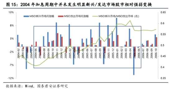 2004年美國債利率整體保持區(qū)間震蕩格局,加息周期內(nèi)權(quán)益市場呈現(xiàn)單邊上漲態(tài)勢。在整個加息周期中并未出現(xiàn)顯著回調(diào),值得注意的是2005年4月到9月的上升階段對應(yīng)的是美國債收益率相對緩和階段,市場在2005年2月、9月的小幅回調(diào)均對應(yīng)著美國債利率的攀升,而在2006年3月之后美國債利率突破前期高點進(jìn)入新的中樞,權(quán)益市場動能也隨后出現(xiàn)弱化,并在4-5月美國債利率加速上行過程中出現(xiàn)回調(diào)。在整個加息周期中,新興上市場股市維持了相對強(qiáng)勢,與發(fā)達(dá)市場始終保持著月度同漲跌的狀態(tài),未出現(xiàn)月度漲跌背離情形。
