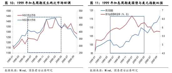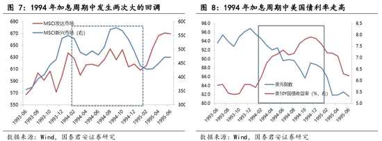 加息周期中新興市場與發(fā)達(dá)市場很少有持續(xù)背離情況,市場大幅調(diào)整與新興市場/發(fā)達(dá)市場股市相對強(qiáng)弱變換高度相關(guān)。1)從市場當(dāng)月漲幅來看,新興市場與發(fā)達(dá)市場并未出現(xiàn)一方上漲另一方下跌持續(xù)超過兩個月的情況,而單月出現(xiàn)漲跌背離的情況僅在1994年4月、1994年6月、1994年9月、1994年10月、1994年12月、1999年8月,更多的是出現(xiàn)在市場回調(diào)的階段,且隨著時間的推移有減少的趨勢,或表明全球權(quán)益市場聯(lián)系更加緊密了。2)新興市場與發(fā)達(dá)市場之間相對強(qiáng)弱的變化與市場發(fā)生的調(diào)整高度相關(guān),主要基于新興市場彈性相對更大的原因,市場回調(diào)過程中新興市場跌幅更大,上漲過程中新興市場也表現(xiàn)更為強(qiáng)勢。3)在加息周期尾聲權(quán)益市場壓力明顯加大,在美國經(jīng)濟(jì)出現(xiàn)弱化后跡象明顯,例如1994年三季度之后、2000年初之后,相較而言美國債收益率相較美元指數(shù)影響更為明顯,“美國債利率+美元指數(shù)”雙強(qiáng)格局下易于觸發(fā)權(quán)益市場調(diào)整。4)在加息周期尾聲,權(quán)益市場的調(diào)整更多的首先表現(xiàn)為發(fā)達(dá)市場股市波動率的上升,而后是新興市場表現(xiàn)出更強(qiáng)力度的回調(diào)。