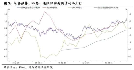 經(jīng)濟(jì)強(qiáng)勢、貨幣政策正常化、通脹預(yù)期是美國利率強(qiáng)勢三大支撐。實際上,美債收益率的上行早已開啟,美國10y國債在2016年中達(dá)到階段性低點1.37%,而后經(jīng)歷2017年3月-9月回調(diào)后繼續(xù)回升,短期的利率加速上行實際是從2018年8月份開始的。與之相對應(yīng)的是美國通脹上行、經(jīng)濟(jì)復(fù)蘇以及加息周期開啟。從美國CPI數(shù)據(jù)來看,從2015年5月由負(fù)轉(zhuǎn)正見底回升,2016年7月加速上行,2017年上半年有所回調(diào)后重新上升,2018年9月為2.3%;從經(jīng)濟(jì)增速來看,美國GDP實際同比在2016年2季度錄得1.3%,此后見底回升,2018年2季度已經(jīng)升至2.87%;從加息周期來看,2015年12月正式開其新一輪加息周期,2016年12月加息1次,2017年加息3次,2018年截至10月已加息3次。綜合來看,美國經(jīng)濟(jì)改善年內(nèi)仍將延續(xù),樂觀情況下可能延續(xù)至2019年2季度,從9月發(fā)布的點陣圖來看,預(yù)計2018年總共加息4次,2019年總共加息3次,而當(dāng)前美國失業(yè)率持續(xù)下降,時薪數(shù)據(jù)維持強(qiáng)勢,隨著美國對伊朗單方面制裁于2018年11月4日生效,石油價格仍面臨著較大不確定性。綜合來看,經(jīng)濟(jì)復(fù)蘇、加息推進(jìn)、通脹隱憂格局預(yù)計在后續(xù)一個階段內(nèi)仍將會延續(xù)。