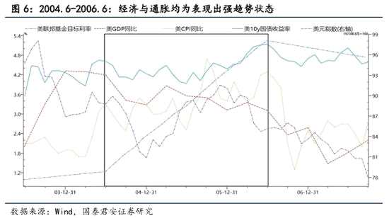 1999.6-2000.5。本輪加息周期中,基準(zhǔn)利率從4.75%上調(diào)至6.5%,累計為175bp,加息6次持續(xù)時間11個月。受互聯(lián)網(wǎng)熱潮驅(qū)動,美國經(jīng)濟(jì)增速處于高位,1998年GDP同比達(dá)到4.88%,1999年2季度GDP同比4.66%,而失業(yè)率達(dá)到4.2%的歷史低位,CPI進(jìn)入1999年后有加速上升跡象,1999年1月CPI同比1.7%,而到1999年4月已升至2.3%,經(jīng)濟(jì)存在過熱風(fēng)險。在加息過程中,通脹率仍維持上行態(tài)勢,2000年3月CPI同比達(dá)到3.8%,此后開始弱化,到2001年5月之后才開始下行,經(jīng)濟(jì)在加息過程中仍維持韌勁,2000年2季度后下行。美元指數(shù)走強(qiáng),而國債收益率則在進(jìn)入2000年后進(jìn)入下行趨勢中,這與加息與通脹仍在趨勢之中,但從經(jīng)濟(jì)增長表現(xiàn)看不確定性明顯增強(qiáng)相一致。