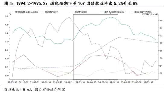 1994.2-1995.2。本輪加息周期中,基準(zhǔn)利率從3.00%上調(diào)至6%,累計為300bp,加息7次持續(xù)時間12個月。1990年日本經(jīng)濟(jì)泡沫破滅,美國經(jīng)濟(jì)也受到影響,失業(yè)率高企,作為應(yīng)對,1992年9月美國聯(lián)邦基金利率降至3%。1994年隨著經(jīng)濟(jì)復(fù)蘇,通脹擔(dān)憂升溫,美聯(lián)儲開啟加息。美國實際GDP同比由1993年3季度2.29%升至1994年3季度4.34%,此后走向回落,而CPI從1994年5月2.3%一直升至1995年5月3.2%,在1994年10月單月有所回調(diào)。在整體加息周期中基本上維持者強(qiáng)勢利率與弱勢美元的格局,其中10y國債由1993年10月5.2%升至1994年11月8%。由此來看,本輪加息是在美國經(jīng)濟(jì)復(fù)蘇尚不穩(wěn)固背景下由通脹擔(dān)憂引發(fā)的,加息的節(jié)奏相對較快,1994年2月-5月每月加息一次,從國債利率走勢看在經(jīng)濟(jì)進(jìn)入下行的加息周期后半程才出現(xiàn)下行態(tài)。