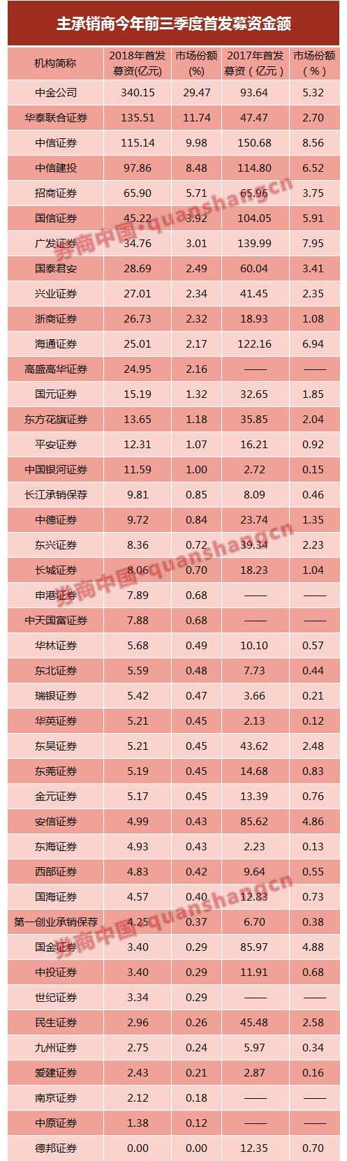 雖然整體募資金額少了三成,但是馬太效應(yīng)凸顯。今年首發(fā)承銷金額最高的券商為中金公司,前三季度IPO募資340.15億元,獨(dú)占29.47%的市場份額;第二名華泰聯(lián)合證券,IPO募資135.51億元,占了11.74%的市場份額;再加上第三名中信證券,115.14億元的額度占據(jù)了9.98%的市場份額。前三名合計(jì)占了過半的市場份額,也是僅有的3家首發(fā)承銷募資金額過百億的券商。