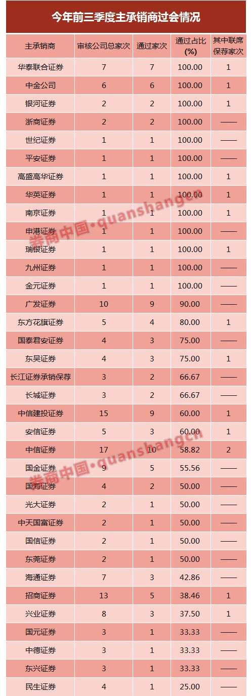 就各券商承銷的IPO過會企業(yè)數(shù)量而言,【中信證券(600030)、股吧】表現(xiàn)最好,前三季度一共有10家企業(yè)過會,其中有2家是聯(lián)席保薦;華泰聯(lián)合證券質(zhì)量最高,7家上會企業(yè)全部過會。