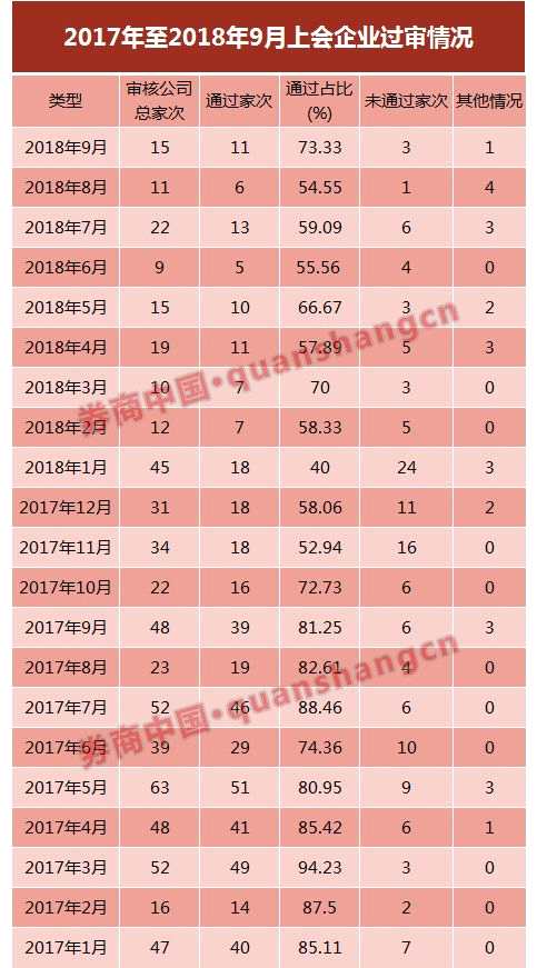 就過會率而言,前三季度過會率大多維持在60%左右,其中最低的是1月份,上會45家企業(yè),僅有18家成功過會,過會率為40%;過會率最高的是9月份,上會企業(yè)15家,過會11家,過會率達(dá)73.33%。不過,即便是過會率最高的9月份,比起去年同期動輒80%、90%的過會率,依然不具有競爭力。