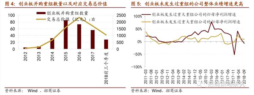 關(guān)注四季度商譽(yù)減值風(fēng)險(xiǎn)。2018年創(chuàng)業(yè)板發(fā)生并購(gòu)重組的數(shù)量大大減少,三季報(bào)業(yè)績(jī)預(yù)告中鮮有披露業(yè)績(jī)承諾完成以及商譽(yù)減值等問(wèn)題,文中將創(chuàng)業(yè)板上市公司按照是否發(fā)生過(guò)重大重組分為兩組,在2015年前后,發(fā)生了資產(chǎn)重組的創(chuàng)業(yè)板公司業(yè)績(jī)?cè)鲩L(zhǎng)明顯高于未發(fā)生過(guò)資產(chǎn)重組公司的業(yè)績(jī)?cè)鲩L(zhǎng),但2018年三季度,之前發(fā)生過(guò)資產(chǎn)重組公司的業(yè)績(jī)下滑更為明顯,預(yù)計(jì)這部分公司在四季度具有計(jì)提商譽(yù)減值的風(fēng)險(xiǎn)。