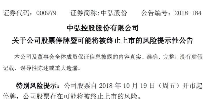 另外還規(guī)定,出現(xiàn)上述情況,公司應(yīng)當(dāng)在事實(shí)發(fā)生的次一交易日披露。公司股票及其衍生品種自公告之日起停牌,深交所自公司股票停牌起十五個(gè)交易日內(nèi)作出公司股票是否終止上市的決定。10月18日晚間,中弘股份發(fā)布公告,將于10月19日起停牌。