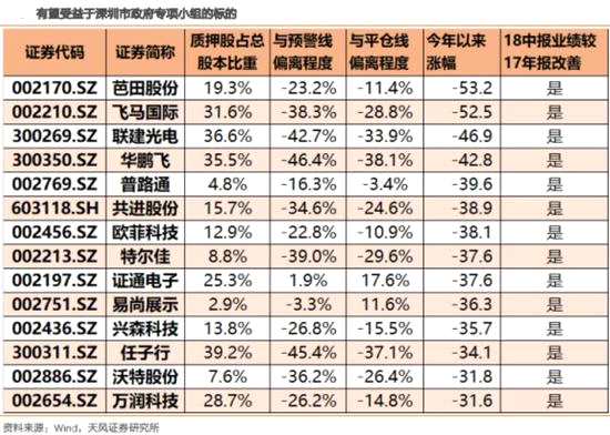 天風(fēng)證券分析師劉晨明的研究結(jié)果顯示,截止10月14日,深圳地區(qū)股票池**有75個涉及股票質(zhì)押且當(dāng)前股價低于預(yù)警線。從今年以來跌幅超過30%和企業(yè)業(yè)績處于上行區(qū)間(2018年中報凈利潤較2017年報改善)兩個標(biāo)準(zhǔn)來看,共有14家潛在政府專項投資標(biāo)的股票。