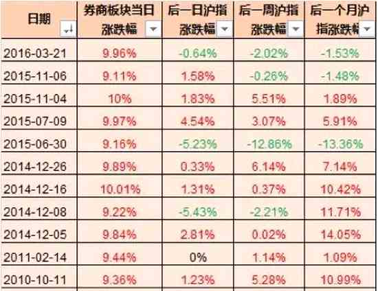 那么,為什么提到券商大漲呢?因為券商板塊向來是市場風向標,其股價通常會領先市場上漲。今天午盤,券商板塊就已全線漲停,據(jù)歷史顯示,券商大漲后一周、后一個月上漲概率普遍較高。統(tǒng)計數(shù)據(jù)顯示,券商大漲后,次日滬指上漲概率為46%,后一周上漲概率為51%,后一個月上漲概率達到59%。