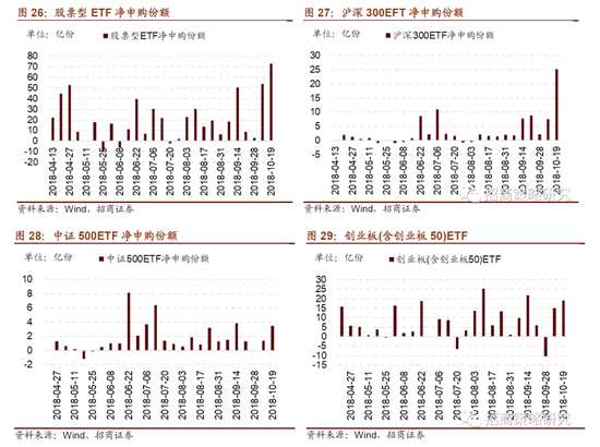 10月15日-10月19日,ETF凈申購(gòu)份額繼續(xù)大幅增加。股票型ETF當(dāng)周凈申購(gòu)份額為72.7億份,較前期增加19.24億份; 滬深300EFT凈申購(gòu)份額為25.13億份,較前期增加17.58億份。中證500ETF凈申購(gòu)3.44億份,較前期增加2.06億份;創(chuàng)業(yè)板(含創(chuàng)業(yè)板50)ETF繼續(xù)凈申購(gòu),申購(gòu)份額為19.09億份。