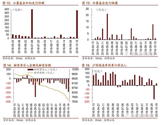 資金供給方面,10月15日-10月19日,公募基金加權(quán)發(fā)行386.9億份,較前期大幅增加370億份,主要源于華夏央企結(jié)構(gòu)調(diào)整ETF和博時(shí)央企結(jié)構(gòu)調(diào)整ETF的發(fā)行,兩只公募ETF分別發(fā)行近159億份和252億份;私募基金成立募資1.3億元,較前期大幅下降11.2億元;融資客繼續(xù)凈賣出282.2億元,規(guī)模較前期提高61.5億元;截至2018年10月19日,融資余額為7648.6億元;陸股通轉(zhuǎn)為小幅凈流入,凈流入25.8億元。