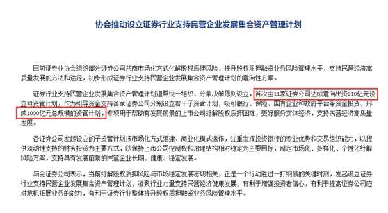 據(jù)公告,目前已初步形成證券行業(yè)支持民營企業(yè)發(fā)展集合資產(chǎn)管理計(jì)劃的意向性方案。首次由11家證券公司達(dá)成意向出資210億元設(shè)立母資管計(jì)劃,形成1000億元總規(guī)模的資管計(jì)劃,專項(xiàng)用于幫助有發(fā)展前景的上市公司紓解股權(quán)質(zhì)押困難,更好服務(wù)實(shí)體經(jīng)濟(jì),支持民營經(jīng)濟(jì)高質(zhì)量發(fā)展。