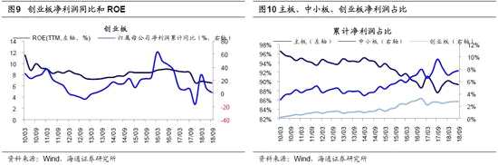 創(chuàng)業(yè)板三季報(bào)凈利累計(jì)同比為1.5%,較中報(bào)繼續(xù)回落。18Q3/18Q2/18Q1創(chuàng)業(yè)板歸屬母公司凈利潤累計(jì)同比為1.5%/8.1%/28.4%,剔除【光線傳媒(300251)、股吧】(一季度營業(yè)外收入較多)后,歸母凈利累計(jì)同比為0.5%/4.8%/21.7%,凈利潤增速較一季度回落。進(jìn)一步看創(chuàng)業(yè)板指數(shù)的情況,歸母凈利潤累計(jì)同比為1.1%/8.2%/33.8%,剔除光線傳媒后,歸母凈利累計(jì)同比為9.8%/12.9%/33.6%,業(yè)績同樣出現(xiàn)回落。三季報(bào)預(yù)告顯示創(chuàng)業(yè)板凈利同比為2.7%,三季報(bào)實(shí)際值略低于預(yù)告值。18Q3/18Q2/18Q1創(chuàng)業(yè)板ROE(TTM)為6.5%/6.7%/6.8%,低于2010年以來均值8.3%。根據(jù)杜邦公式拆解,18Q3/18Q2/18Q1創(chuàng)業(yè)板凈利率為9.1%/9.5%/10.1%,資產(chǎn)周轉(zhuǎn)率為0.51/0.50/0.50次,資產(chǎn)負(fù)債率為41.7%/41.3%/39.9%。過去幾年,創(chuàng)業(yè)板業(yè)績?cè)鲩L源于外延式擴(kuò)張和內(nèi)生增長,但目前外延式并購難度加大,只能更多依靠內(nèi)生增長,那么外延式并購對(duì)創(chuàng)業(yè)板業(yè)績影響如何呢?我們以2011年以來創(chuàng)業(yè)板未進(jìn)行重大資產(chǎn)重組公司為樣本,可得18Q3/18Q2/18Q1創(chuàng)業(yè)板未進(jìn)行重組公司凈利累計(jì)同比為25.3%/11.0%/40.3%,而創(chuàng)業(yè)板曾進(jìn)行重組的公司為5.4%/7.4%/28.4%,兩者依然分化,可見創(chuàng)業(yè)板仍在消化外延式并購對(duì)業(yè)績的影響。今年以來創(chuàng)業(yè)板業(yè)績持續(xù)下滑,即源于主營業(yè)務(wù)收入增速放緩,也源于非主營項(xiàng)目開支增多。18Q3/18Q2/18Q1創(chuàng)業(yè)板營收同比為18.1%/19.9%/21.2%,主營成本為23.9%/26.3%/26.1%,收入增速放緩是業(yè)績下滑主因。此外,18Q3創(chuàng)業(yè)板累計(jì)研發(fā)支出/資產(chǎn)減值損失為256/143億元,占?xì)w母凈利潤的46%/17%,較17Q3增加47%/115%,這也拖累業(yè)績?cè)鲩L。18Q3/18Q2/18Q1創(chuàng)業(yè)板財(cái)務(wù)費(fèi)用+銷售費(fèi)用累計(jì)同比為34.0%/44.8%/55.4%,而管理費(fèi)用+研發(fā)費(fèi)用(可比口徑)為34.3%/35.2%/33.0%,在經(jīng)濟(jì)增速放緩背景下企業(yè)各項(xiàng)成本開支增速應(yīng)隨之放緩,但企業(yè)管理費(fèi)用+研發(fā)費(fèi)用保持穩(wěn)定增長,這說明研發(fā)支出大增不僅僅源于會(huì)計(jì)標(biāo)準(zhǔn)調(diào)整,還源于企業(yè)研發(fā)意愿增強(qiáng)。結(jié)合歷史數(shù)據(jù)和自下而上分析,我們推算18年創(chuàng)業(yè)板凈利同比為2%,對(duì)應(yīng)ROE為6%。