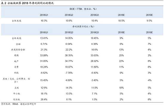 主板三季報(bào)凈利累計(jì)同比為11.0%,較中報(bào)回落。18Q3/18Q2/18Q1主板歸屬母公司凈利潤累計(jì)同比為11.0%/14.3%/12.6%,凈利同比增速較中報(bào)回落。18Q3/18Q2/18Q1主板ROE(TTM)為10.8%/11.0%/10.6%,仍低于2005年以來均值為12.1%。主板盈利回升始于2016年中,歸母凈利累計(jì)同比從16Q2的-6.7%最高升至17Q1的19.7%,全年維持高增長,2017年凈利同比為19.5%,進(jìn)入2018年主板業(yè)績?cè)鏊匍_始下滑。按照杜邦公式拆分,18Q3/18Q2/18Q1主板凈利率為10.2%/10.5%/10.5%,資產(chǎn)周轉(zhuǎn)率為0.166/0.165/0.162次,資產(chǎn)負(fù)債率為85.1%/85.3%/85.2%,ROE回落主要源于凈利潤率和資產(chǎn)負(fù)債率回落。結(jié)合歷史數(shù)據(jù)和自下而上分析,我們推算18年主板凈利同比增速為10%,ROE為10.6%。