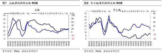 中小板三季報(bào)凈利累計(jì)同比為7.1%,較中報(bào)繼續(xù)回落。18Q3/18Q2/18Q1中小板歸屬母公司凈利潤累計(jì)同比為7.1%/13.5%/18.1%,剔除券商后歸母凈利累計(jì)同比為8.3%/14.6%/19.3%,凈利同比增速較中報(bào)下滑。進(jìn)一步看中小板指數(shù)的情況,歸母凈利潤累計(jì)同比為12.1%/19.2%/14.1%,剔除券商后中小板指歸母累計(jì)凈利同比為27.5%/37.1%/25.1%。三季報(bào)預(yù)告顯示中小板凈利同比為13.0%,三季報(bào)實(shí)際值略低于預(yù)告值。中小板盈利回升始于16年中,歸母凈利累計(jì)同比從16Q2的12.4%最高升至16Q4的30.6%,2017年仍保持高增長,全年凈利同比為19.0%。但是,進(jìn)入2018年后業(yè)績快速回落,這既源于主營業(yè)務(wù)增速放緩,也源于非主營項(xiàng)目開支增多。18Q3/18Q2/18Q1中小板營收同比為19.1%/21.3%/24.3%,營業(yè)成本同比22.0%/24.4%/27.1%,收入增速放緩是業(yè)績下滑主因。此外,18Q3中小板研發(fā)費(fèi)用/資產(chǎn)減值損失為767/377億元,占?xì)w母凈利潤的34%/14%,較17Q3增加43%/64%,這也拖累業(yè)績?cè)鲩L。18Q3/18Q2/18Q1中小板財(cái)務(wù)費(fèi)用+銷售費(fèi)用累計(jì)同比為24.5%/26.1%/36.4%,而管理費(fèi)用+研發(fā)費(fèi)用(可比口徑)為25.9%/19.1%/21.5%,在經(jīng)濟(jì)增速放緩背景下企業(yè)各項(xiàng)成本開支增速應(yīng)隨之放緩,但企業(yè)管理費(fèi)用+研發(fā)費(fèi)用仍在增長,這說明研發(fā)支出大增不僅僅源于會(huì)計(jì)標(biāo)準(zhǔn)調(diào)整,還源于企業(yè)研發(fā)意愿增強(qiáng)。18Q3/18Q2/18Q1中小板ROE(TTM)為9.4%/9.6%/9.1%,仍低于2010年以來均值9.7%。根據(jù)杜邦公式拆解,18Q3/18Q2/18Q1中小板凈利率為7.4%/7.5%/7.2%,資產(chǎn)周轉(zhuǎn)率為0.509/0.534/0.525次,資產(chǎn)負(fù)債率為60.0%/58.1%/57.3%,ROE回落源于凈利潤率和資產(chǎn)周轉(zhuǎn)率回落。結(jié)合歷史數(shù)據(jù)和自下而上分析,我們推算18年中小板凈利同比為5%,對(duì)應(yīng)ROE為8.6%。