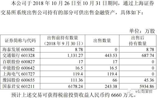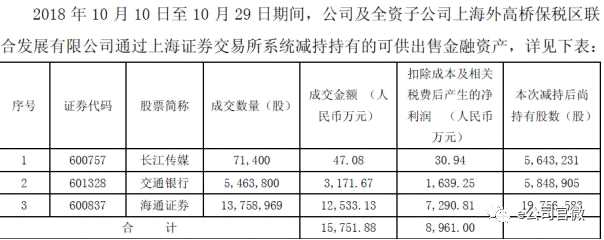10月10日至29日,外高橋及全資子公司外聯(lián)發(fā)減持了所持【長(zhǎng)江傳媒(600757)、股吧】、交通銀行和海通證券部分股份,實(shí)現(xiàn)凈利潤(rùn)合計(jì)約8961萬(wàn)元。