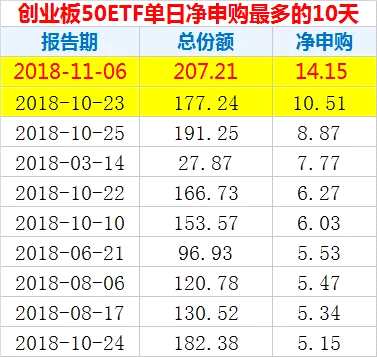 易方達(dá)創(chuàng)業(yè)板ETF的份額同樣創(chuàng)出新高。10月22日,凈申購5.8億份;11月2日,易方達(dá)創(chuàng)業(yè)板ETF成交額為25億元,創(chuàng)兩年以來新高,規(guī)模也隨即突破200億元,創(chuàng)下創(chuàng)業(yè)板ETF史上規(guī)模最高值。