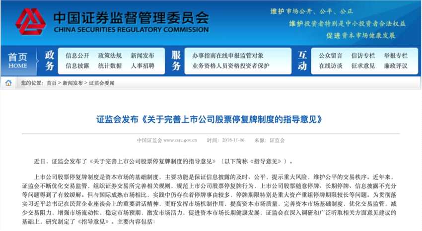 6日晚間,證監(jiān)會發(fā)布《關于完善上市公司股票停復牌制度的指導意見》,主要內(nèi)容包括: