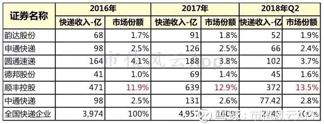 據(jù)統(tǒng)計,2016年至2018年Q2季度,全國快遞業(yè)務(wù)收入分別為3974億、4957億、2795億,作為速運物流上市企業(yè)之一的“順豐”,其快遞業(yè)務(wù)收入占全國快遞企業(yè)營收的11.9%、12.9%、13.5%,快遞業(yè)務(wù)收入市場份額逐步提高,而且遠遠超過三通一達以及德邦在快遞市場的收入份額。