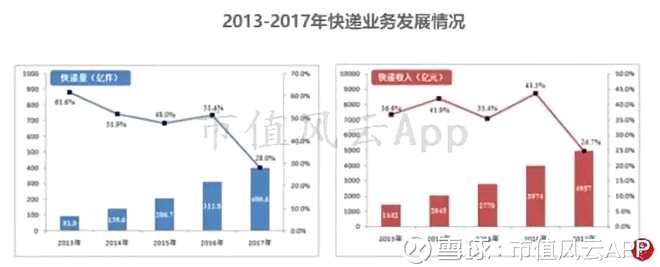2017年,快遞量和快遞收入的增速開始出現(xiàn)大幅回落,快遞量業(yè)務(wù)從上年的51%下降至28%,快遞收入從上年43.5%的增速下降至24.7%。