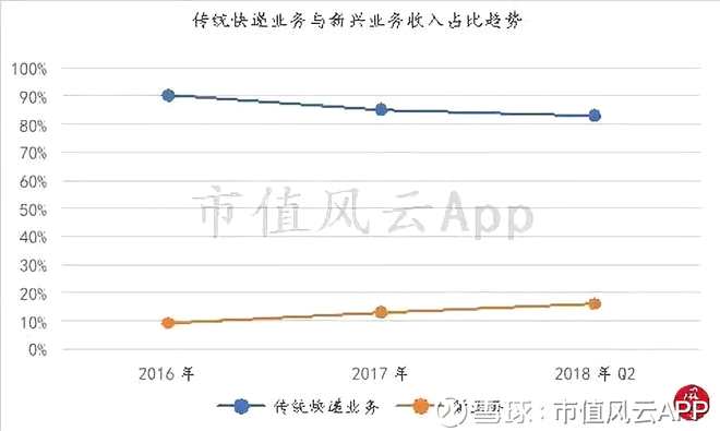 在新業(yè)務(wù)高速發(fā)展的勢頭下,2016年-2018年上半年,傳統(tǒng)快遞業(yè)務(wù)的營收占比依次下降,分別為總營收的90%、85%、83%;新興業(yè)務(wù)對應(yīng)營收占比分別為9%、13%、16%,逐年提高。