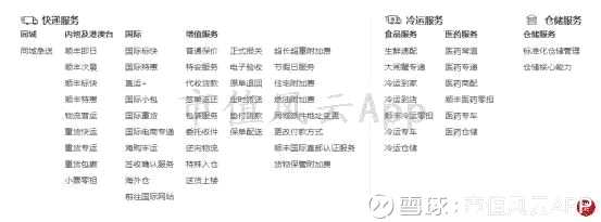 就其物流產(chǎn)業(yè)布局來看,順豐的產(chǎn)品線極其豐富,除了傳統(tǒng)的國內(nèi)、國際在內(nèi)的快遞服務(wù),還包括物流普運、重貨快運等重貨運輸服務(wù),面向生鮮食品、醫(yī)藥領(lǐng)域客戶提供的冷鏈運輸服務(wù),倉儲服務(wù);另外,在物流服務(wù)的基礎(chǔ)上,順豐還提供保價、代收貨款、托管等增值服務(wù),以滿足客戶個性化、全面的速運物流需求。