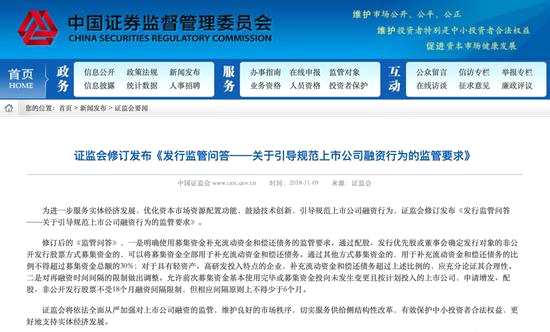 11月9日,證監(jiān)會(huì)修訂發(fā)布《發(fā)行監(jiān)管問(wèn)答——關(guān)于引導(dǎo)規(guī)范上市公司融資行為的監(jiān)管要求》(以下簡(jiǎn)稱《監(jiān)管問(wèn)答》),修改了兩項(xiàng)關(guān)鍵規(guī)則:
