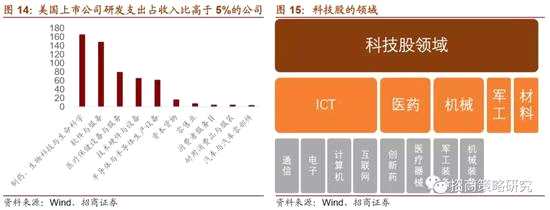因此,在當(dāng)前的科技進(jìn)步,主要集中在信息領(lǐng)域,除此之外,醫(yī)藥醫(yī)療技術(shù)、軍工技術(shù)、材料技術(shù)也在快速發(fā)展。我們統(tǒng)計(jì)了美國(guó)上市公司研發(fā)支出占收入比5%以上的公司,主要集中在制藥生物科技、軟件與服務(wù)、醫(yī)療保健與設(shè)備、硬件技術(shù)與設(shè)備、技術(shù)硬件與設(shè)備、半導(dǎo)體與半導(dǎo)體生產(chǎn)設(shè)備等領(lǐng)域。