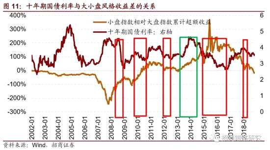 申萬大盤和小盤指數(shù)相對(duì)收益在2007年以前波動(dòng)不大,2007年開始,伴隨著利率大幅上行,大盤股明顯占優(yōu),大盤股相對(duì)小盤股指數(shù)最超額收益超過200%。2008年1月后,伴隨利率中樞下行,小盤股指數(shù)相對(duì)抗跌,2008年10月十年期國(guó)債利率跌破3.5%,A股反彈至3月份社融增速大幅提升,小盤股相對(duì)大盤有明顯的超額收益。此后幾輪十年期國(guó)債利率處在3.5%以下,基本是小盤股相對(duì)占優(yōu)。今年七月初,十年期國(guó)債利率短暫跌破3.5%,小盤股指數(shù)相對(duì)收益回升,但后續(xù)十年期國(guó)債利率反彈,小盤股指數(shù)經(jīng)歷了“最后的出清”。今年11月1日,十年期國(guó)債正式跌破3.5%,宣告小盤風(fēng)格來臨。