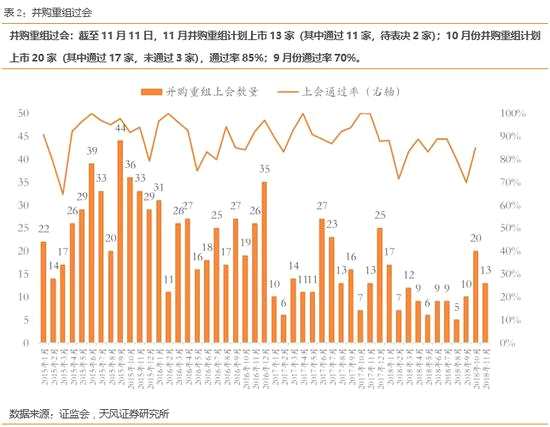 其他我們重點關注的指標里,并購重組通過情況提升:截至11月11日,11月份股權融資規(guī)模179.53億元,其中首發(fā)10.71億元,增發(fā)110.12億元;10月份股權融資規(guī)模267.23億元,其中首發(fā)98.71億元,增發(fā)133.75億元。截至11月11日,11月并購重組計劃上市13家(其中通過11家,待表決2家);10月份并購重組計劃上市20家(其中通過17家,未通過3家),通過率85%;9月份通過率70%。