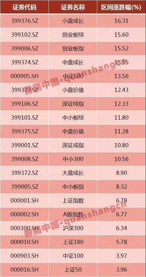 從各大指數(shù)表現(xiàn)來看,自10月19日至今,漲幅前三名均與中小創(chuàng)有關(guān),分別是小盤成長、創(chuàng)業(yè)板指和創(chuàng)業(yè)板綜,漲幅均超15%,分別達(dá)到16.31%、15.6%和15.52%。漲幅位居末尾的則是以大盤股為主,分別是上證180、中證100、上證50,漲幅僅有5.78%、3.97%和3.96%。