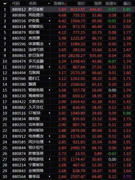 板塊方面,低價股、體育概念、傳媒娛樂、互聯(lián)網(wǎng)、釀酒板塊漲幅居前。