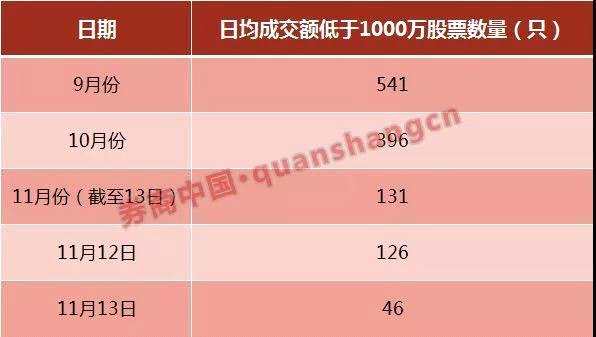據(jù)券商中國記者統(tǒng)計,9月份日均成交額低于1000萬的股票共有541只;10月份有所減少,日均成交額低于1000萬的股票共有396只;11月份(截至13日)日均成交額低于1000萬的股票數(shù)量降至131只。