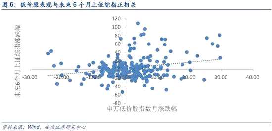 總的來說,我們認(rèn)為市場運(yùn)行符合我們前期判斷,近期市場的風(fēng)險(xiǎn)偏好出現(xiàn)了一定程度的修復(fù)。近期低價(jià)股表現(xiàn)活躍,其往往是A股市場回暖的領(lǐng)先指標(biāo),歷史數(shù)據(jù)顯示其與未來6個(gè)月上證綜指表現(xiàn)有正相關(guān)性,但其自身行情未必具有中期持續(xù)性。