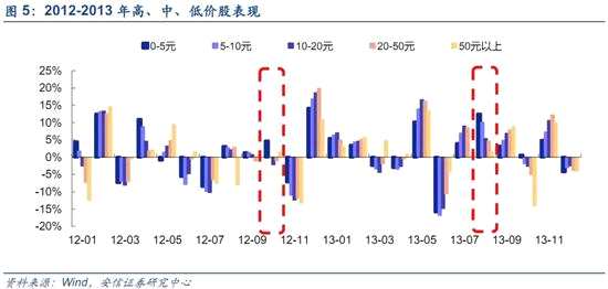 我們在此前的報(bào)告當(dāng)前可借鑒的歷史是2012-A股歷史底部啟示錄中曾經(jīng)指出,低價(jià)股相對指數(shù)取得明顯的超額收益一般來自于兩種情形:一種是在市場處于底部區(qū)間,情緒極度悲觀環(huán)境下,低價(jià)股往往在前期下跌過程中出現(xiàn)超跌,因此在糾錯(cuò)行情中表現(xiàn)會(huì)更加猛烈。另外一種情況是在市場進(jìn)入牛市中后期后,低價(jià)股往往會(huì)出現(xiàn)一輪凌厲的漲勢,上漲往往來自于場外個(gè)人投資者的邊際資金入場,推動(dòng)低價(jià)股持續(xù)上漲。