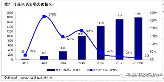 在收并購熱潮的推動(dòng)下,傳媒公司商譽(yù)自2013年以來快速擴(kuò)大,2014年與2015年為傳媒行業(yè)并購大年,商譽(yù)增速均在100%以上,直至收并購監(jiān)管趨嚴(yán),商譽(yù)增速在2016年開始放緩至42%,而后持續(xù)下降,2018年上半年商譽(yù)增速降至10%。收購標(biāo)的輕資產(chǎn)的特性使傳媒公司有較多商譽(yù)計(jì)入,2018上半年傳媒所有公司商譽(yù)占總資產(chǎn)比為16.68%。
