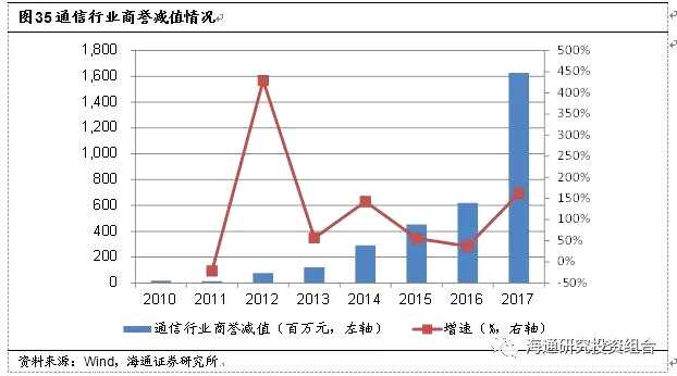 2010年至今,A股通信行業(yè)上市公司的總商譽(yù)呈逐步上升態(tài)勢,2012年-2017年的增速分別為94.28%、76.31%、109.44%、131.63%、41.06%和53.73%;其增加值分別為12.72億元、20.00億元、50.58億元、127.41億元、92.06億元和169.93億元。伴隨2015~2017年行業(yè)并購事件的快速增加,總商譽(yù)的量也大幅增加;但基于A股2015年6月異常波動(dòng)、2015年商譽(yù)增速觸頂,2016年商譽(yù)增加的增速大幅放緩。