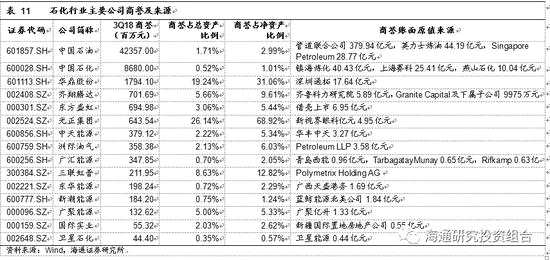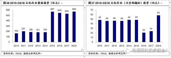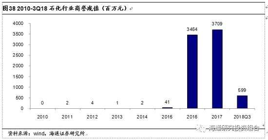 2018年三季度末,石化行業(yè)商譽(yù)合計(jì)569億元,排名行業(yè)第十。2018年11月16日,證監(jiān)會(huì)發(fā)布《會(huì)計(jì)監(jiān)管風(fēng)險(xiǎn)提示第8號(hào)》,對(duì)商譽(yù)減值的會(huì)計(jì)監(jiān)管風(fēng)險(xiǎn)進(jìn)行提示。截止2018年三季度末,所有A股上市公司商譽(yù)合計(jì)1.45萬億元,其中傳媒、醫(yī)藥、計(jì)算機(jī)、機(jī)械行業(yè)的商譽(yù)均在1000億元以上?;A(chǔ)化工行業(yè)商譽(yù)753.28億元;石油化工行業(yè)商譽(yù)為568.60億元。
