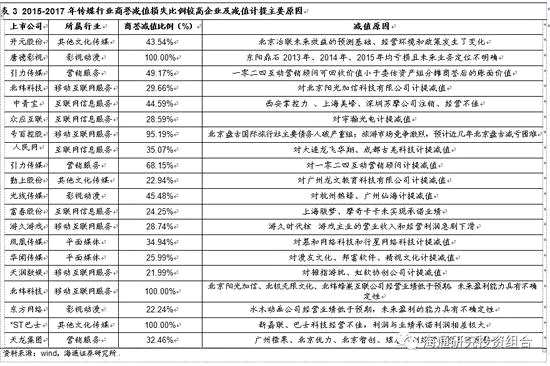 2015-2017年,傳媒行業(yè)共有52家公司產(chǎn)生過商譽(yù)減值損失,我們通過計(jì)算“本期商譽(yù)減值損失/(本期減值損失+期末商譽(yù))”衡量公司在一個(gè)區(qū)間內(nèi)減值損失程度,總結(jié)了該指標(biāo)大于20%的公司商譽(yù)減值的主要情況和原因,如下表所示。
