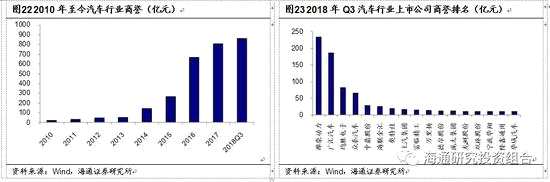 截至2018年Q3,汽車行業(yè)共179家上市公司,包括整車、零部件、經(jīng)銷商,商譽(yù)合計(jì)862億元,居于全行業(yè)第5位。我們估計(jì)2018年全年商譽(yù)接近1000億元,同比增長接近20%,較2010年增長約50倍,主要原因是兼并收購,尤其大額的跨國收購。