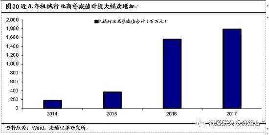 3.5.2     近年來機(jī)械行業(yè)商譽(yù)減值計(jì)提顯著增長3.5.2 近年來機(jī)械行業(yè)商譽(yù)減值計(jì)提顯著增長  我們對(duì)SW機(jī)械設(shè)備中的所有機(jī)械行業(yè)上市公司進(jìn)行分析,我們發(fā)現(xiàn)2014-2017年,機(jī)械行業(yè)商譽(yù)減值呈現(xiàn)逐年增加的態(tài)勢,2014年僅1.84億元,而到2016-2017年則激增至15.63億元和17.89億元。