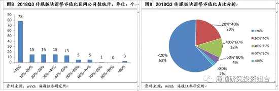 根據(jù)《企業(yè)會(huì)計(jì)準(zhǔn)則第8號(hào)-資產(chǎn)減值》規(guī)定,企業(yè)合并所形成的商譽(yù),至少應(yīng)當(dāng)在每年年度終了進(jìn)行減值測試,如包含商譽(yù)的資產(chǎn)組或資產(chǎn)組組合的可收回金額低于其賬面價(jià)值,應(yīng)當(dāng)確認(rèn)減值損失,計(jì)入當(dāng)期損益,對(duì)商譽(yù)的監(jiān)管比之前更為嚴(yán)格。我們認(rèn)為,未來由標(biāo)的業(yè)績未達(dá)預(yù)期引發(fā)的商譽(yù)減值損失成為上市公司業(yè)績變臉的“雷區(qū)”。2018年第三季度,傳媒板塊中有接近41%的上市公司商譽(yù)在10億以上,其中商譽(yù)市值占比超過50%的公司占比為9.33%;我們預(yù)計(jì)2018-2019年將成為業(yè)績承諾完成期最后一年與“N+1”年高度集中區(qū)間,商譽(yù)減值爆發(fā)率也會(huì)相應(yīng)增加,警惕商譽(yù)占市值比重較大的個(gè)股成為2018和2019年投資決策的重點(diǎn)。為避免商譽(yù)風(fēng)險(xiǎn),上市公司理論上可以采用剝離并表子公司的方式徹底消除商譽(yù),但由于需要較高PE才能將商譽(yù)剝離,資金成本較大,整體很難實(shí)現(xiàn)。