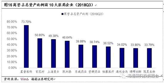 截至2018Q3,A股醫(yī)藥企業(yè)中,商譽(yù)占總資產(chǎn)比例高于30%的企業(yè)數(shù)量為14家,超過20%的達(dá)35家。其中,商譽(yù)占總資產(chǎn)比例靠前的藥企為星普醫(yī)科、百花村、上海萊士、凱利泰、東誠藥業(yè)、譽(yù)衡藥業(yè)、恒康醫(yī)療、通化金馬、博暉創(chuàng)新、冠昊生物等。