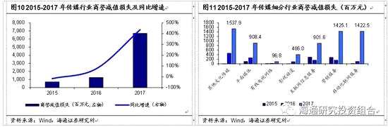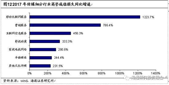 3.1.2     商譽(yù)減值:3.1.2 商譽(yù)減值:  2017年商譽(yù)減值損失增幅巨大,細(xì)分行業(yè)表現(xiàn)分化。分析2015-2017年傳媒板塊商譽(yù)減值損失,我們發(fā)現(xiàn)2017年同比增速達(dá)到436.07%,遠(yuǎn)超2015年同比增速(-16.63%)和2016年同比增速(74.38%)。細(xì)分板塊分布上,2017年移動(dòng)化聯(lián)網(wǎng)服務(wù)、營銷服務(wù)和互聯(lián)網(wǎng)信息服務(wù)同比增速分別到達(dá)1223.73%、786.43%和456.28%,遠(yuǎn)超其他行業(yè)。