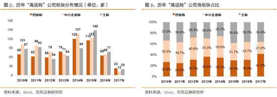 創(chuàng)業(yè)板比重提升而是近幾年“高送轉(zhuǎn)”公司分布的主要趨勢(shì)。從板塊分布看,近年來主板 “高送轉(zhuǎn)”公司占比略有降低,而創(chuàng)業(yè)板公司的占比提升明顯。具體數(shù)據(jù)方面,2017年年報(bào)“高送轉(zhuǎn)”公司中,屬于主板、中小板和創(chuàng)業(yè)板的公司分別為20家、12家和23家,分別占比36.4%、21.8%和41.8%,而早在2010年,三個(gè)板塊的占比分別為33.9%、39.3%和26.8%。